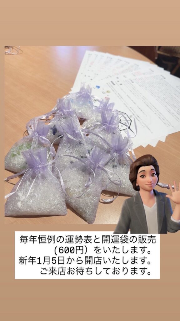 占いサロンルチルでは新年恒例の2026年度の『運勢表』(無料)と『お守り石』の販売(600円)をさせて頂きます。基本的にご予約は不要ですが、運勢表の説明等お聞きになりたい方はご予約をお取り頂くことをオススメいたします。
